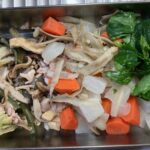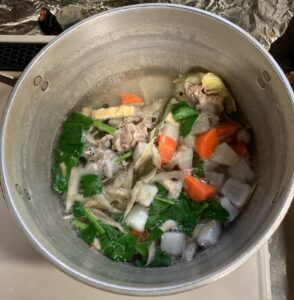 入っているのは大根・人参・ごぼう・豚肉・里芋・こんにゃく・ぶなしめじ・山菜ミックス・油揚げ・椎茸・白菜・ほうれん草・白ネギ。