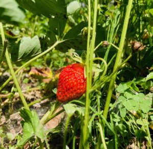 畑でいちごが赤くなり始めました。