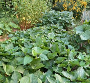 畑ではサツマイモがぐんぐん元気に育っているところ。