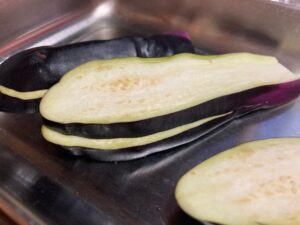 - ナスは1cm程度の厚さに切り、間にも包丁を入れます。