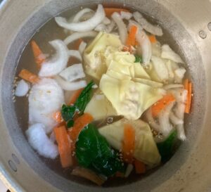 沸騰したら、ここに野菜とワンタンを入れて、中火で火が通るまで加熱。