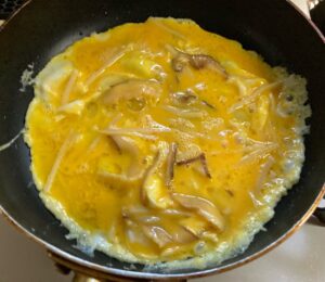 - 卵(1人前2個を1人前ずつ溶き、塩と具材ミックスを入れておく)を1人前ずつ焼きます。焼き方はお好みで。