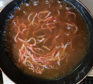 - あんをまとめて作ります。フライパンに調味料液とかに風味かまぼこを入れて、加熱し、沸騰したら水溶き片栗粉を入れて、とろみをつけて火を止めます。