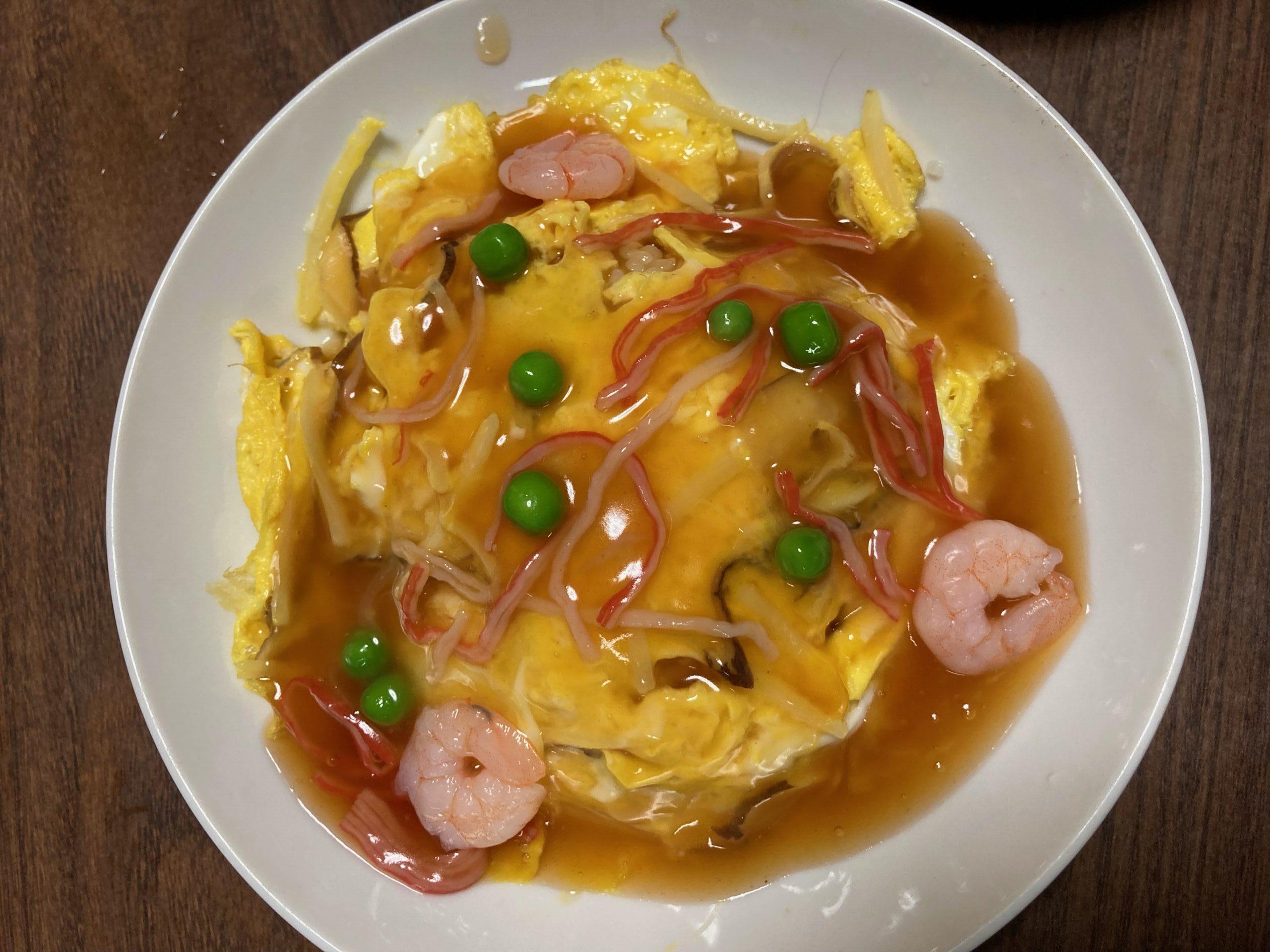 - あんを卵の上にかけて、グリーンピースとボイル済み海老を盛りつけて完成です。