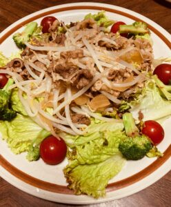 牛丼の具はレンジでチンするだけですが、そこにゆでたもやしをプラスして混ぜ混ぜ。