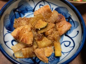 - ズッキーニ、玉ねぎを一口サイズに切ります。